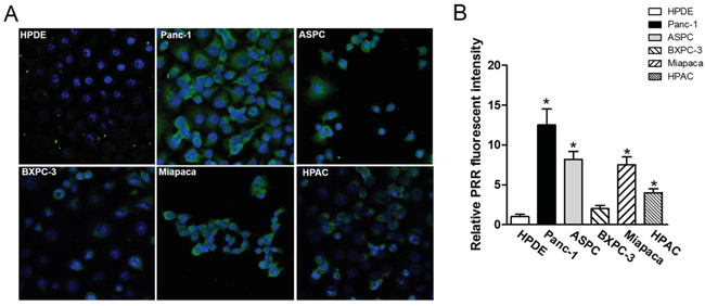 Figure 5: Confocal fluorescence microscopy imaging of PRR in pancreatic cancer cell lines Panc-1, ASPC, BXPC-3, Miapaca-2, and HPAC as well as normal pancreas HPDE. A. human PRR expression in pancreatic cancer cell lines: Panc-1, ASPC, BXPC-3, Miapaca-2, and HPAC as well as normal pancreas HPDE using confocal fluorescence microscopy. B. Quantitation of fluorescence intensity by image J. All images were acquired under the same condition and displayed at the same scale. Magnification: 60x. Data are means ± SEM. *, p<0.05 vs. HPDE cells.