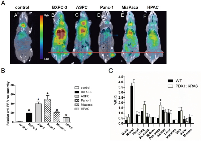 The present study revealed PRR acts as a potential molecular target for PDAC diagnosis. To our knowledge, this is the first demonstration that PRR might be as a target for SPECT/CT imaging of pancreatic cancer. Several studies have shown that PRR plays an important role in tumorigenesis including pancreatic cancer [13]. In human pancreatic cancer samples analysis, we observed that PRR was highly expressed at early stages of human PanIN lesions, and human PDAC, whereas it was not expressed in normal pancreatic ductal cells. We also found that PRR was significantly expressed in human pancreatic cell lines, ASPC, Miapaca-2, Panc-1, HPAC and BxPC-3 compared with normal pancreatic cells HPDE. Through SPECT/CT imaging, Panc-1, ASPC, Miapaca, HPAC, and BXPC-3 cells xenografted to nude mice by 125I-labelled anti-PRR, and displayed a clear and specific accumulation of radioactivity in mice harboring subcutaneous Panc-1, ASPC, or Miapaca pancreatic tumors xenografts after 96 h. Importantly, the biodistribution study using human pancreatic cancer mouse model with engineered mutant KrasG12D activation revealed the uptake of 125I-anti-PRR was markedly elevated in pancreas of Pdx1-cre; LSL-KrasG12D mice than WT control littermates at 4 months of age. Thus, our findings indicate that elevated PRR is able to monitor for pancreatic tumor growth and may serve as a promising target for pancreatic cancer diagnosis.