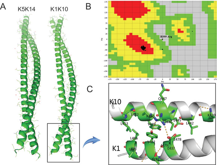 The homology modeling of K1/K10 coiled-coil structure was conducted with MODELLER. The α-helix structure of the resulting K1/K10 heterodimer is structurally quite similar with the K5/K14 heterodimer (Figure 1A). The structural quality of the K1/K10 homology model was validated with Ramachandran plots and RMSD of the alignments using PROCHECK and VADAR. Figure 1B shows that our built model has high quality according to the resulting Ramachandran plots which contain ≥ 90% of their residues in allowed regions. The RMSD calculated by PyMOL is 1.646 Å, which is much lower than general cut-off value, 2.8 Å.