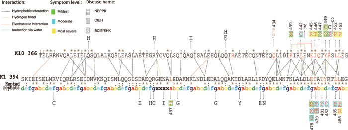 (i) Different mutated amino acids at specific positions of both K1 and K10 cause different phenotypes, e.g. p.E478K and p.E478Q of K1 causes BCIE/EHK and CIEH respectively; p.Y449D and p.Y449C of K10 causes BCIE/EHK and CIEH respectively.