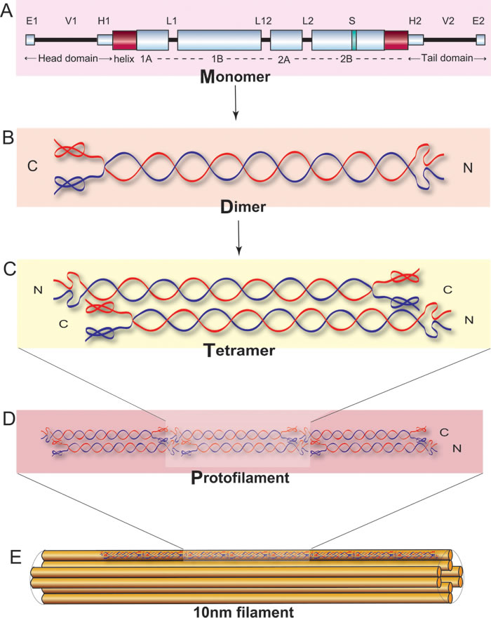 There are no publically available crystal structures for K1/K10 in the protein data bank (PDB). We thus approximate the K1/K10 3D structures by homology modeling. This is a valid approach as keratin belongs to a very well-known family of intermediate filament structural proteins, which share similar sequence and structure. By running pair-wise sequence similarity searching using NCBI-BLAST against PDB entries under default parameters, we found that K5/K14 (PDB ID: 3TNU, corresponding only to the 2B domain), had 76% of sequence identity between K1/K5 and 64% between K10/K14. Construction of the initial structure of the K1/K10 heterodimeric coiled-coil complex involved two steps. Firstly, HOMCOS [23], a user-friendly web server was used to obtain the respective monomer structures of K1 and K10 according to the template of 3TNU. Second, we applied the MODELLER scripts in order to combine the two monomers. These two steps combine the two monomers generated by HOMCOS into a heterodimeric coiled-coil structure [24].