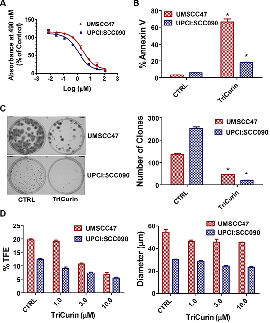 Figure 1: TriCurin promotes a global anti-tumor response in HPV-positive HNSCC. (A) IC50. The MTS reagent was used to measure cell proliferation. Dose response curve and IC50 of TriCurin were generated using GraphPad Prism software. (B) Apoptosis. UMSCC47 and UPCI:SCC090 cells were treated with control or TriCurin (3 μM+). Cells were stained with FITC-Annexin V and propidium iodide and analyzed by flow cytometry. Data are presented as mean ± SEM. *P < 0.01, n = 3. (C) Clonogenic survival. UMSCC47 and UPCI:SCC090 cells were treated with control or TriCurin (3 μM+). The number of surviving clones was assessed by counting the number of clones under a microscope after crystal violet staining. A representative well for each experimental condition is shown and data are presented as mean ± SEM. *P < 0.01, n = 3. (D) Tumorsphere formation efficiency and diameter. UMSCC47 and UPCI:SCC090 cells were treated with control or TriCurin (1, 3, or 10 μM+) and cultured in ultralow attachment plates. Tumorsphere formation efficiency was calculated as the number of tumorspheres formed divided by the original number of cells seeded. Tumorsphere diameter was measured using NIS-Elements software. Data are presented as mean ± SEM. *P < 0.01, n = 3 for tumorsphere formation efficiency. *P < 0.05, n = 3 for tumorsphere diameter.