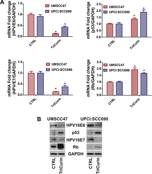Figure 2: TriCurin reduces HPV16E6/E7 and enhances p53/Rb levels in HPV-positive HNSCC. UMSCC47 and UPCI:SCC090 cells were treated with control or TriCurin (3 μM+ for 72 hours. (A) HPV16E6/E7 and p53/Rb mRNA expression. mRNA expression was determined by qRT-PCR. Data were normalized to GAPDH and presented as mean ± SEM. *P < 0.001, n = 5. (B) HPV16E6/E7 and p53/Rb protein levels. Protein levels were determined by immunoblot analyses.