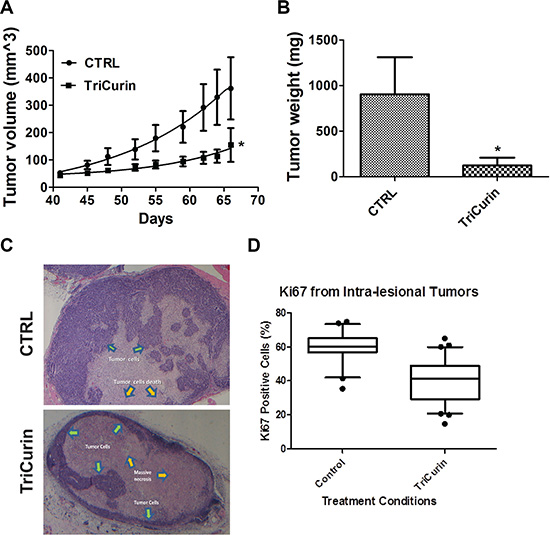 Figure 3: TriCurin retards tumor growth in a pre-clinical model of HPV-positive HNSCC. (A) Tumor volume. UMSCC47 cells were implanted into the flanks of athymic nude mice and tumors were allowed to develop without treatment. At 41 days post-tumor cell implantation, mice with palpable tumors were randomly assigned to two treatment arms: vehicle or TriCurin (3×/week for 5 weeks). Tumors were measured using a digital caliper and tumor volumes were calculated. Data are presented as mean ± SEM. *P < 0.05, n = 7. (B) Tumor weight. Mice were sacrificed at the end of the treatment protocol and tumors were resected and weighed. Data are presented as mean ± SEM. *P < 0.01, n = 7. (C) H&E histopathology. A representative image from a tumor in the control or TriCurin-treated group is shown. Tumors from TriCurin-treated mice showed large necrotic areas (yellow arrows) with residual tumor cells (green arrows) in the periphery. Tumors from control-treated mice were multi-lobulated with large areas populated with residual tumor cells. (D) Ki67 staining. Typical areas for each case were photographed with a 20× objective lens and shown. The Ki67 labeling index was scored as the percentage of tumor cell nuclei showing definite nuclear immunoreactivity above the background level using Image J. Data are presented as mean ± SEM. *P < 0.003.
