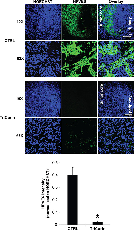 Figure 4: TriCurin reduces intra-tumoral levels of HPV16E6. Representative immunofluorescence images from a tumor in the control or TriCurin-treated group are shown (scale bar: 300 μm). Nuclear staining with HOECHST33342 was used to normalize for HPV16E6 staining intensity. Data are presented as mean ± SEM. *P < 0.001.
