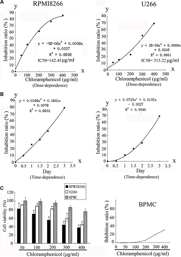 Figure 1: Inhibition of RPMI8266 and U266 human MM cell proliferation. (A) Proliferation of RPMI8266 and U266 cells human MM cells was dose-dependently decreased by treatment with chloramphenicol for 48 h. IC50 values were 142.45 μg/ml and 315.22 μg/mL at 48 h with RPMI8266 and U266 cells, respectively. (B) The proliferation of human MM cell lines was decreased by chloramphenicol in a time-dependent manner (chloramphenicol: 100 μg/mL). (C) Proliferation of normal PBMCs was weakly decreased by chloramphenicol. Results are expressed as the mean ± SEM (error bars) for four separate experiments; *P < 0.05.
