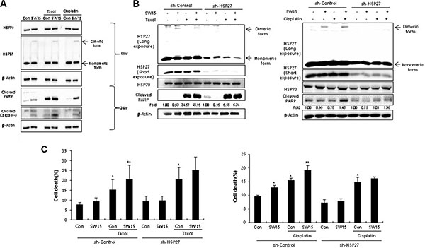 To elucidate whether SW15-mediated sensitization by altered cross linking of HSP27 was a universal phenomenon, anticancer drugs taxol or cisplatin were combined with SW15. Cell viability, cleaved casepase-3 and PARP cleavage data suggested that combination of SW15 with cisplatin or taxol sensitized the lung cancer cells (Supplementary Figure S7 and Figure 7A). Moreover, cells with stably transfected shHSP27 with reduced SW15-mediated altered cross linking of HSP27 showed less sensitization to taxol or cisplatin in combination with SW15, when it was examined by cleaved PARP production (Figure 7B). Cell death as detected with PI staining also suggested that SW15 potentially increased cell death in combination with taxol or cisplatin in HSP27 overexpressed cells (Figure 7C).