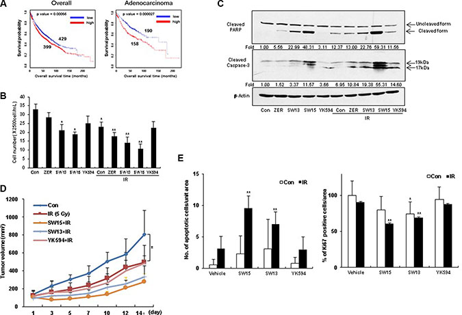 Figure 6: The xanthone compound induced radiosensitization. (A) Kaplan-Meier (KM) plot for hsp27 gene in overall lung cancer patients (including adenocarcinoma and squamous cell carcinoma patients) and lung adenocarcinoma patients was shown with p value. (B) NCI-H460 cells were treated with ZER, SW13, SW15, and YK594 (10 μM) with or without IR (3 Gy). After 24 h of irradiation, cell survival was counted using trypan-blue. Results are the means and standard deviations of three independent experiments (*p < 0.05 vs untreated control cells and **p < 0.05 vs IR alone treated cells). (C) Cleavage of PARP and Caspase-3 was analyzed by Western blot. Relative band intensity of the cleaved form of proteins was calculated by comparing densitometric scans of the sample immunoblots with the values of control samples set at 1 and expressed as a fold increase. Zerumbone (ZER, 10 μM) was used for a positive control. (D) NCI-H460 cells were injected subcutaneously into BALB/c nude mice (n = 3/group). After 5 Gy irradiation, xenografted mice were treated 6 times with SW15, SW13 or YK594 (6.8 mg/kg) delivered with a local regional application. Tumor size was measured twice weekly. Results are the means and standard deviations (*p < 0.05). (E) TUNEL staining (left) and Ki-67 staining (right) were performed using tumor tissues. Graph represents mean and standard deviation (*p < 0.05 vs untreated control group and **p < 0.05 vs IR alone group).