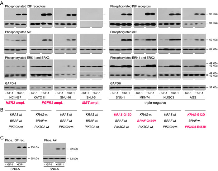 Figure 2: Activation of signal transduction pathways in gastric cancer cells. NCI-N87, KATO III, SNU-16, SNU-5, SNU-1, MKN74, NUGC3 and AGS were withdrawn for one (SNU-1) or two days, stimulated with 50 ngml-1 IGF-1 for 15 min and lysed A. and C. Aliquots of 10 μg of protein were electrophoresed on polyacrylamide gels, transferred to nitrocellulose and incubated with antibodies against, phosphorylated IGF receptors, type I IGF receptor, phosphorylated Akt, pan Akt, phosphorylated ERK1 and ERK2, ERK1 and ERK2, or GAPDH and developed. Representative images from incubations with the same antibody concentrations and exposure times for each detection antibody are shown to allow comparison between cell lines. Images obtained after incubation with antibodies against the total individual proteins are beneath those of the corresponding phosphorylated proteins. Driver amplifications and mutations discussed in the text are shown in bold cerise B. For SNU-5, additional longer exposures after incubation with higher concentrations of the type I IGF receptor and phosphorylated IGF receptor antibodies and after incubation with the same concentration of phosphorylated Akt antibody and are shown C.