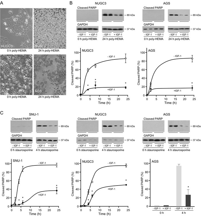 Figure 3: Protective effect of IGF-1 against anoikis and apoptosis in triple-negative gastric cancer cells. For induction of anoikis, NUGC3 and AGS cells were added to uncoated or poly-HEMA-coated plates A. or to poly-HEMA-coated plates in the absence or presence of 50 ngml-1 IGF-1 B. Cells cultured in poly-HEMA-coated plates lost their characteristic polygonal appearance and grew as rounded detached cells A. Cells were lysed and the amount of cleaved PARP was analysed by Western transfer B. The amount of cleaved PARP was measured by densitometric scanning of the X-ray films, corrected for GAPDH expression with Labworks 4 software and expressed as the percentage of the maximum value measured for each cell line. The mean values ± SEM are shown. Asterisks indicate times at which cleaved PARP levels are statistically significantly lower in the presence of IGF-1 than in its absence (Two-way ANOVA; NUGC3, p < 0.0001; AGS, p < 0.0001). For apoptosis, SNU-1, NUGC3 and AGS cells were incubated with staurosporine in the absence and presence of 50 ngml-1 IGF-1 C. Cells were lysed and cleaved PARP measured and analyzed as described above (Two-way ANOVA; SNU-1, p < 0.0001; NUGC3, p < 0.0001; AGS, p = 0.0002).