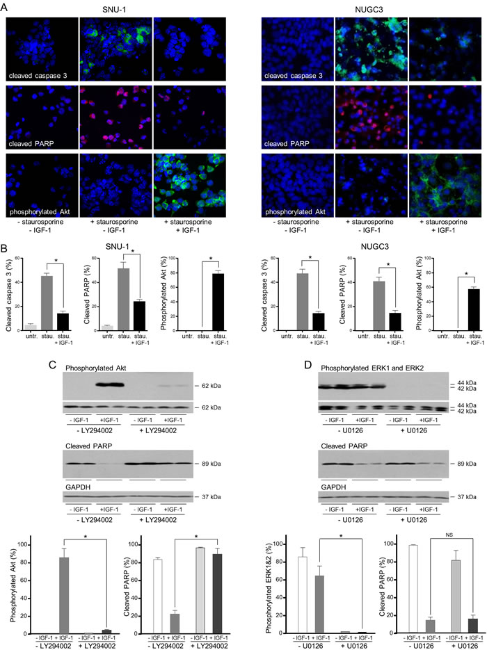 Figure 4: IGF protects gastric cancer cells from caspase-dependent cell death via the PI3-kinase/Akt pathway. SNU-1 and NUGC3 cells were treated for 4 and 24 h, respectively with staurosporine (stau.) in the absence and presence of 50 ngml-1 IGF-1. Cells were fixed and incubated with antibodies against cleaved caspase 3, cleaved PARP and phosphorylated Akt A. and B. Nuclei were identified with the DAPI DNA dye. The proportion of cells with detectable cleaved caspase 3, cleaved PARP and phosphorylated Akt is shown as means ± SEM. Asterisks indicate differences that are statistically significant (One-way ANOVA; SNU-1, cleaved caspase 3, p < 0.0001; cleaved PARP, p = 0.0002; phosphorylated Akt, p < 0.0001; NUGC3, cleaved caspase 3, p < 0.0001; cleaved PARP, p < 0.0001; phosphorylated Akt, p < 0.0001). SNU-1 cells were treated with staurosporine in the absence and presence of 50 ngml-1 IGF-1 and 20 µM LY294002 or 6 μM U0126 inhibitor, lysed and cleaved PARP, phosphorylated Akt, ERK1 and ERK2 were measured and corrected for the expression of GAPDH or total corresponding protein C. Asterisks indicate phosphorylated protein levels that are significantly lower in the presence of an inhibitor than in its absence (Two-way ANOVA; phosphorylated Akt, p < 0.0001; phosphorylated ERK1 and ERK2, p = 0.0006) or cleaved PARP levels that are statistically significantly higher in the presence of an inhibitor (Two-way ANOVA; for LY294002 inhibitor, p = 0.0001. NS indicates values that are not significantly different.