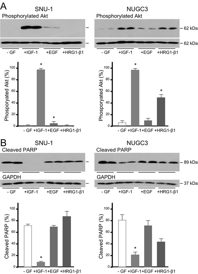 Figure 5: IGF, but not EGF or heregulin, protects gastric cancer cells from caspase-dependent cell death. SNU-1 and NUGC3 cells were incubated with staurosporine in the absence (-GF) and presence of 50 ngml-1 IGF-1, EGF or HRG1-β1. Phosphorylated Akt, total Akt, cleaved PARP and GAPDH were measured and analyzed as described in the legends to figures 3 and 4 A. and B. Asterisks indicate differences that are statistically significant (One-way ANOVA; cleaved PARP, SNU-1 IGF-1, p < 0.0001; NUGC3, IGF-1, p < 0.01).