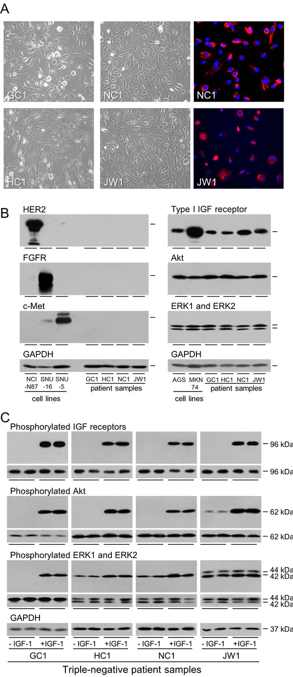 Figure 6: Expression and activation of the IGF signal transduction pathway in patient samples. GC1, HC1, NC1 and JW1 cells were grown to 70% confluence and photographed or fixed and incubated with fluorescently-labelled antibody against epithelial cytokeratins A. Expression of HER2, FGFR2, c-Met, type I IGF receptor, Akt, ERK1 and ERK2 were analyzed by western transfer as described in the legend to Figure 1 B. GC1, HC1, NC1 and JW1 cells were withdrawn for two days and stimulated with 50 ngml-1 IGF-1 for 15 min. Phosphorylation of IGF receptors, Akt, ERK1 and ERK2 was analyzed by western transfer as described in the legend to Figure 2A.