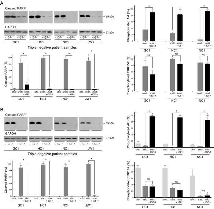 Figure 7: Role of IGF signal transduction in the survival of gastric cancer patient samples induced to undergo anoikis or apoptosis. GC1, HC1, NC1 and JW1 cells were grown in poly-HEMA-coated wells, in the absence or presence of 50 ngml-1 IGF-1 for 24 h (GC1 and HC1) or 6 h (NC1 and JW1) A. Cells were incubated in the absence or presence of 0.5 μM staurosporine (GC1, HC1 and JW1) or 1 μM staurosporine (NC1), in the absence or presence of 50 ngml-1 IGF-1 for 5 h B. Cells were lysed and cleaved PARP, GAPDH, phosphorylated Akt, ERK1 and ERK2 were measured. Asterisks indicate levels that are statistically significantly lower or higher in the presence of IGF-1 than in its absence (One-way ANOVA; for anoikis GC1; cleaved PARP, p < 0.0001, pAkt, p < 0.001, HC1; cleaved PARP, p = 0.0003, NC1, cleaved PARP, p < 0.0011, pAkt, p = 0.0003; JW1, cleaved PARP, p < 0.0004; for apoptosis; GC1; cleaved PARP, p < 0.0001, pAkt, p < 0.001, HC1; cleaved PARP, p < 0.0001, pAkt, p < 0.0001, NC1, cleaved PARP, p < 0.0001, pAkt, p = 0.0033; JW1, cleaved PARP, p < 0.0001). NS indicates values that are not significantly different.