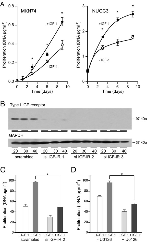 Figure 8: IGF-1 stimulates gastric cancer cell proliferation via the type I IGF receptor and Ras/Raf/MAP-kinase pathway. MKN74 and NUGC3 cells were plated in 16-mm-diameter wells, incubated in the absence or presence of 50 ngml-1 IGF-1, lysed and their DNA content measured A. Asterisks indicate times at which there were significantly more cells in the presence of IGF-1 than in its absence (Two-way ANOVA; MKN74, p < 0.0001; NUGC3, p < 0.0001). NUGC3 cells were transfected with 20, 30 or 40 nM of a scrambled oligonucleotide or siRNA oligonucleotides against the type I IGF receptor, cultured for three days and type I IGF receptor and GAPDH expression analysed B. NUGC3 cells were transfected with either a scrambled oligonucleotide or si IGF-IR 2 and cultured in the absence or presence of 50 ngml-1 IGF-1 for 9 days, C. NUGC3 cells were incubated with 6 μM U0126 inhibitor, in the absence or presence of IGF-1 for 9 days D. Asterisks indicate statistically significant reduction in IGF-stimulated proliferation after receptor knockdown (Two-way ANOVA; p < 0.0001) or after incubation with U0126 (Two-way ANOVA; p < 0.0001).