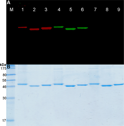 Figure 1: Fusion proteins labeling with BG-PEG24-IR700. (A) SDS-PAGE followed by fluorescence visualization and (B) subsequent Coomassie staining of BG-PEG24-IR700 or BG-Vista Green coupled to the SNAP-tag fusion proteins. Lanes 1–3: Fusion proteins (scFv-425-SNAP-tag, anti-EpCAM(scFv)-SNAP-tag and anti-CSPG4(scFv)-SNAP-tag) were labeled with a two-fold molar excess of BG-PEG24-IR700. Lanes 4–6: The same proteins were labeled with BG-Vista Green. Lanes 7–9: The SNAP-tag blocking reagent BTP was added to the fusion proteins, followed by incubation with a two-fold molar excess of BG-PEG24-IR700, then a two-fold molar excess of BG-Vista Green. M: Prestained Protein Marker Broad Range (7−175 kDa). Fluorescence visualization of Vista Green (green bands) and IR700 (red bands) was achieved using the CRi Maestro multispectral imaging system.