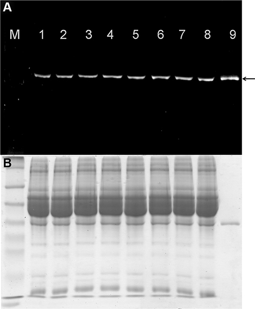 Figure 2: Stability of fluorescence-labeled scFv-425-SNAP protein in mouse serum. (A) The IR700 fluorescence signal was detected using the CRi Maestro multispectral imaging system (black arrow). M: Prestained Protein Marker Broad Range (7−175 kDa). Lanes 1–8: scFv-425-SNAP-IR700 incubated with mouse serum for 0, 0.5, 1, 2, 3, 4, 5 and 6 h. Lane 9: scFv-425-SNAP-IR700 positive control. (B) Corresponding SDS-PAGE gel showing scFv-425-SNAP-IR700 stained with Coomassie Brilliant Blue.