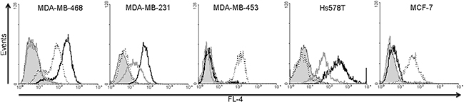 Figure 3: Analysis of EGFR, EpCAM and CSPG4 protein expression in MDA-MB-468, MDA-MB-231, MDA-MB-453, HS578T and MCF7 cell lines. Flow cytometry was carried out after incubating the cells with Alexa Fluor®647-labeled scFv-SNAP fusion proteins against EGFR (black curves), EpCAM (dotted black curves) and CSPG4 (gray curves) for 30 min at 37°C in PBS. The filled gray curves represent the non-stained control.