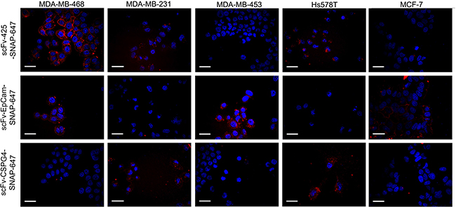 Protein internalization was measured by confocal microscopy. MDA-MB-468, MDA-MB-453, MDA-MB-231, Hs758T and MCF-7 cells were seeded in 96- well plates suitable for fluorescence microscopy (Greiner Bio-One, Frickenhausen, Germany) to a density of 4000 cells/well and incubated overnight at 37°C. The cells were incubated with the fluorescent scFv-SNAP-Alexa Fluor®647 fusion proteins specific for EGFR, EpCAM and CSPG4 for 60 min at 37°C. Hoechst 33342 fluorescent nuclear counterstain (Thermo Fisher Scientific, Darmstadt, Germany) was added to the cells and incubated for 20 min at 37°C. Images of the cells were captured using the Opera High Content Screening System (PerkinElmer, Rodgau, Germany) with a 40× air objective.