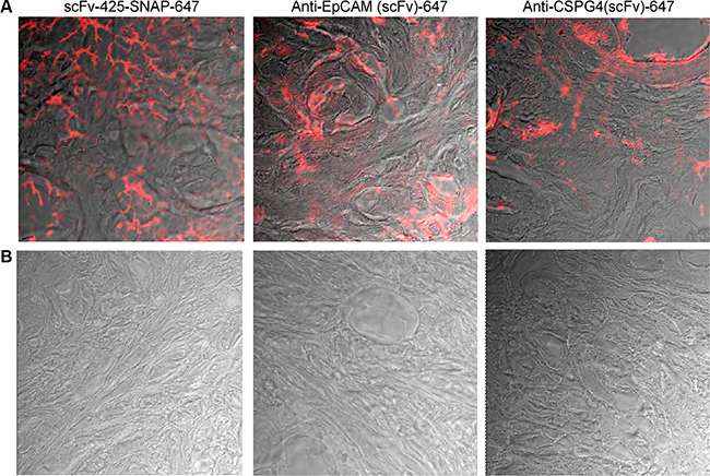 Figure 5: Fluorescence immunohistochemistry of scFv-SNAP-Alexa Fluor®647-labeled proteins against EGFR, EpCAM and CSPG4 in human breast cancer tissues (A) and normal breast tissue (B). Biopsies were incubated with scFv-425-SNAP-Alexa Fluor®647, anti-EpCam(scFv)-SNAP-Alexa Fluor®647 or anti-CSPG4(scFv)-SNAP-Alexa Fluor®647 overnight at 4ºC. A TCS SP5 confocal microscope was used to visualize Alexa Fluor®647 signals (red) on the breast cancer tissues.