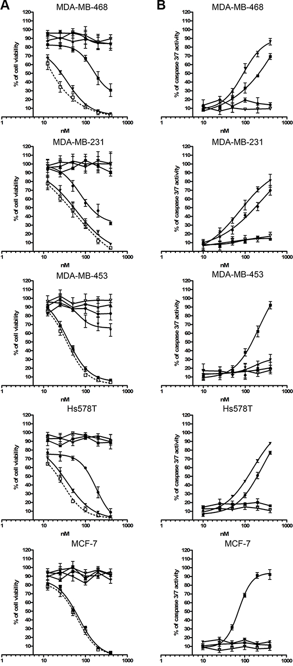 Figure 6: Toxic activity of photoimmunotheranostic agents against four TNBC cell lines and MCF-7. (A) The cytotoxicity of scFv-425-SNAP-IR700 (▼), anti-EpCAM(scFv)-SNAP-IR700 (■), anti-CSPG4(scFv)-SNAP-IR700 (●), the mixture of all three photoimmunotheranostic agents (□), IR700 only ( Δ) and the mixture of all three photoimmunotheranostic reagents applied in the absence of NIR irradiation (▲) was evaluated by cell viability assays using four different TNBC cell lines (MDA-MB-468, MDA-MB-453, MDA-MB-231 and Hs758T) and one ER+ cell line (MCF-7). Cells were incubated with increasing concentrations of each reagent, separately or in combination, or with IR700 (0, 10, 25, 50, 100, 200 and 400 nM). (B) Induction of apoptosis by photoimmunotheranostic agents (separately) and by IR700, assessed using the Apo-ONETM Homogeneous Caspase-3/7 assay.