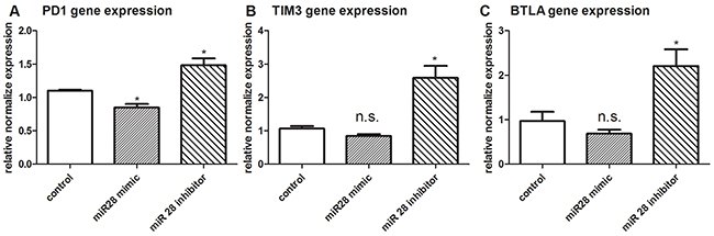 Figure 5: PD1, TIM3, BTLA gene expression after transfection with miR-28 mimic or miR-28 inhibitor. Two million lymphocytes, collected from lymph nodes of B16F10-bearing mice, were transfected with 1 µg of miR-28 mimic or miR-28inhibitor, then cells were made exhaustive by the culture with anti-CD3e (10 µg/ml) coating plates for 72 hrs. The expression of PD1 A. TIM3 B. and BTLA C. were detected by qPCR. T test was used for the miRNA gene expression compared to the control group. Significance was assumed if the P value was less than 0.05 (* = P<0.05), n.s. (not significant) means P value was more than 0.05. The data shown are representative of at least three independent experiments.