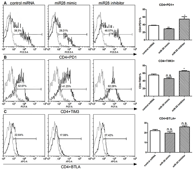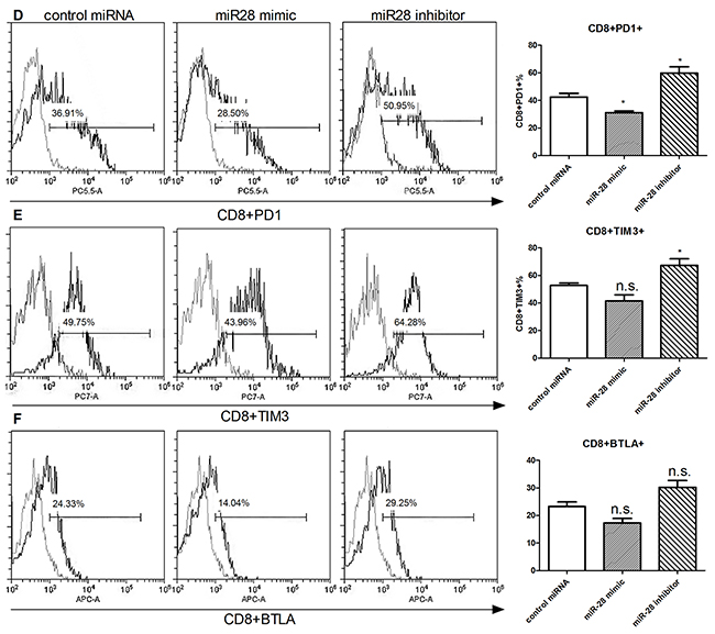 Figure 6: Alteration of exhaustive phenotype of T cells after transfection of miR-28 mimic and miR-28 inhibitor. Two million lymphocytes, collected from lymph nodes of B16F10-bearing mice, were plated per well in a 24 well plate and transfected with 1 µg of miR-28 mimic or miR-28 inhibitor, then cells were cultured in anti-CD3e (10 µg/ml) coating plates for 72 hrs. Flow cytometric analysis were performed to determine the expression of exhaustion phenotype on CD4+ T cells A-C. and CD8+ T cells. D-F. Significance was assumed if P<0.05 using one-way analysis of variance followed by a Dunnett’s multiple comparison test, and denoted as *=P<0.05 and **=P<0.01. n.s. (not significant) means P value was more than 0.05. The date shown are representative of three independent experiments.