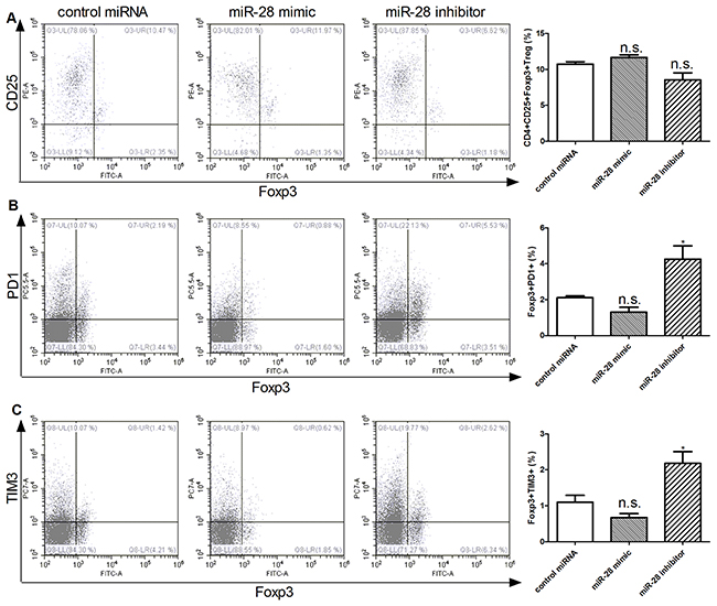 Figure 7: miR-28 regulating FoxP3+PD1+ and Foxp3+TIM3+ Treg cells. Two million lymphocytes, collected from lymph nodes of B16F10-bearing mice, were plated per well in a 24 well plate and transfected with 1 µg of miR-28 mimic or miR-28 inhibitor, then cells were cultured with anti-CD3e (10 µg/ml) coating plates for 72 hrs. Flow cytometric analysis were performed to determine the subsets of conventional CD4+CD25+Foxp3+ Treg A. Foxp3+PD1+ T cells B. and C. Foxp3+TIM3+ T cells. The miRNA mimics or inhibitor group were compared to control group using an unpaired student’s T test. Significance was assumed if the P value was less than 0.05 (* = P<0.05). n.s. (not significant) means P value was more than 0.05. The data shown are representative of at least three independent experiments.