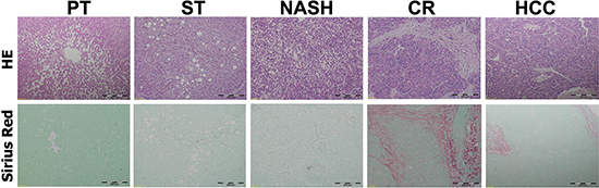 Figure 1: Histologic appearances of peritumoral normal and ST-NAHS-cirrhosis-HCC progression. Upper: Representative histologic changes from different stages by Hematoxylin and Eosin (H&E) staining, magnification: 40×. Lower: Representative histologic changes to reveal fibrosis and cirrhosis by Sirius Red staining, magnification: 40×. PT: peritumoral tissues; ST: steatosis with diffuse lipid deposition; NASH: lipid deposition with inflammatory cells infiltration; CR: cirrhosis with regenerative nodule; HCC: hepatocellular carcinoma.