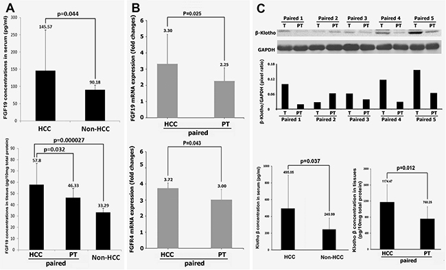 Figure 2: Expressions of FGF19, FGFR4 and of β-Klotho in HCC. (A) the protein levels of FGF19 in serum from 24 HCC patients and 6 non-HCC controls, and in the tissues from 24 paired HCC-peritumoral and 6 non-HCC controls by ELISA analysis. (B) the mRNA levels of FGF19 and FGFR4 from 24 paired HCC-peritumoral tissues. (C) upper: Representative Western blot for β-Klotho protein detection of 5 paired tissues from HCC patients. Lower: the protein levels of β-Klotho in serum from 24 HCC patients and 6 non-HCC controls, and in the tissues from 24 paired HCC-peritumoral tissues by ELISA analysis. T: HCC tumor tissue; PT: peritumoral tissues.