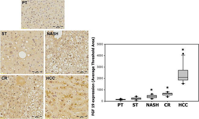 Figure 3: Expression of FGF19 in ST-NAHS-cirrhosis-HCC progression. Representative immunohistochemical staining for FGF19 and the computer quantification of FGF19 expression from different stages. Magnification: 200×, the positive staining shown as brown color. PT: peritumoral tissues; ST: steatosis with diffuse lipid deposition; NASH: lipid deposition with inflammatory cells infiltration; CR: cirrhosis with regenerative nodule; HCC: hepatocellular carcinoma. *p < 0.05 vs PT.