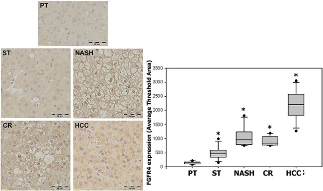 Figure 4: Expression of FGFR4 in ST-NAHS-cirrhosis-HCC progression. Representative immunohistochemical staining for FGFR4 and the computer quantification of FGFR4 expression from different stages. Magnification: 200×, the positive staining shown as brown color. PT: peritumoral tissues; ST: steatosis with diffuse lipid deposition; NASH: lipid deposition with inflammatory cells infiltration; CR: cirrhosis with regenerative nodule; HCC: hepatocellular carcinoma. *p < 0.05 vs PT.