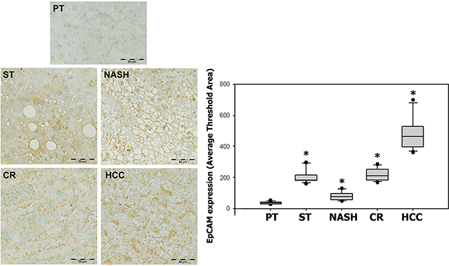 Figure 5: Expression of EpCAM in ST-NAHS-cirrhosis-HCC progression. Representative immunohistochemical staining for EpCAM and the computer quantification of EpCAM expression from different stages. Magnification: 200×, the positive staining shown as brown color. PT: peritumoral tissues; ST: steatosis with diffuse lipid deposition; NASH: lipid deposition with inflammatory cells infiltration; CR: cirrhosis with regenerative nodule; HCC: hepatocellular carcinoma.*p < 0.05 vs PT.