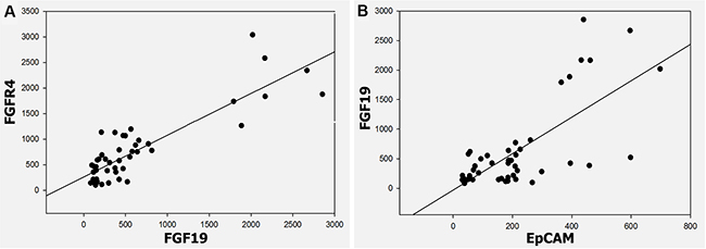 Figure 6: Correlation between FGF19 and FGFR4, FGF19 and EpCAM in ST-NAHS-cirrhosis-HCC progression. (A) Positive correlation of FGF19 and FGFR4 expression in HCC (r = 0.79) (p < 0.001). (B) Positive correlation of FGF19 and EpCAM expression in HCC (r = 0.852) (p < 0.001).
