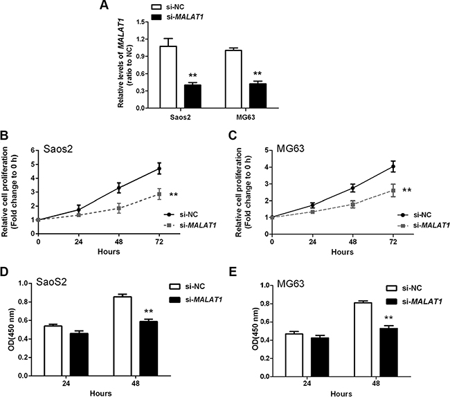 Figure 2: MALAT1 promotion of osteosarcoma cell growth in vitro. (A) MALAT1 knockdown was achieved by si-MALAT1 and the inhibitory efficiency was verified by real-time PCR. (B and C) MTT assays revealed that knockdown of MALAT1 attenuated the growth of both Saos2 and MG63 cell lines up to three days, compared with si-NC group. (D and E) BrdU assays revealed that knockdown of MALAT1 markedly reduced DNA synthesis in both Saos2 and MG63 cell lines. Data are presented as mean ± SD of three independent experiments.