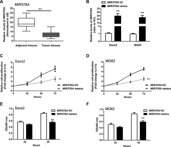 Figure 3: MIR376A suppression of osteosarcoma cell growth in vitro. (A) Expression of MIR376A was downregulated in OS tissues compared with adjacent normal tissues. (B) MIR376A mimics were used to achieve MIR376A overexpression as confirmed by real-time qPCR in Saos2 and MG63 cell lines. (C and D) Cell growth of both Saos2 and MG63 cell lines were reduced in response to MIR376A overexpression compared with MIR376A NC group. (E and F) Results from BrdU incorporation assays indicated that MIR376A overexpression markedly reduced DNA synthesis in both Saos2 and MG63 cell lines compared with the MIR376A-NC group. Data are presented as mean ± SD of three independent experiments.
