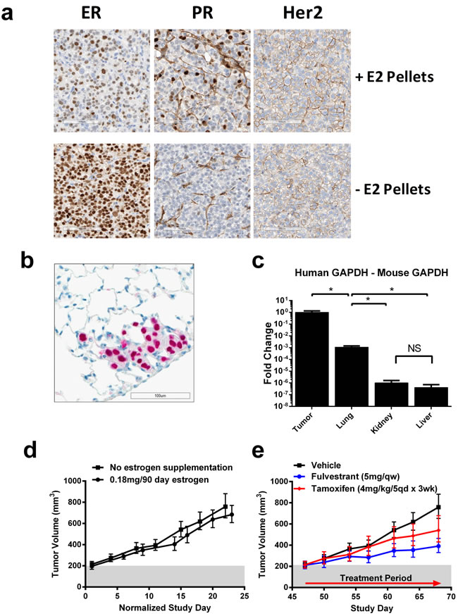 Figure 1: Human CTX model harboring D538G mutation recapitulates endocrine resistant, ER+ disease and metastasizes to the lungs. A. Representative immunohistochemical staining of ER/PR/Her2 of tumors from CTC-174 tumor bearing mouse supplemented with estrogen pellets (0.18mg/90d) (top) and without estrogen supplementation (bottom). B. Human specific DNA-PKcs staining of a representative metastatic CTC-174 lung lesion. C. Detection of tumor tissue in tumor and mouse tissues using PCR for human and mouse GAPDH. Data represents the fold change of human GAPDH compared with mouse GAPDH. N = 3, * indicates p < 0.05. D. Tumor growth in vehicle treated animals +/- estrogen supplementation (0.18mg/90d). N = 7 animals. E. Efficacy of tamoxifen and fulvestrant in CTC-174 tumors. N≥7 animals. Bars represent SEM. Tamoxifen tumor growth inhibition (TGI) = 40.21%, p = 0.0546, Fulvestrant TGI = 66.54%, p = 0.0001.