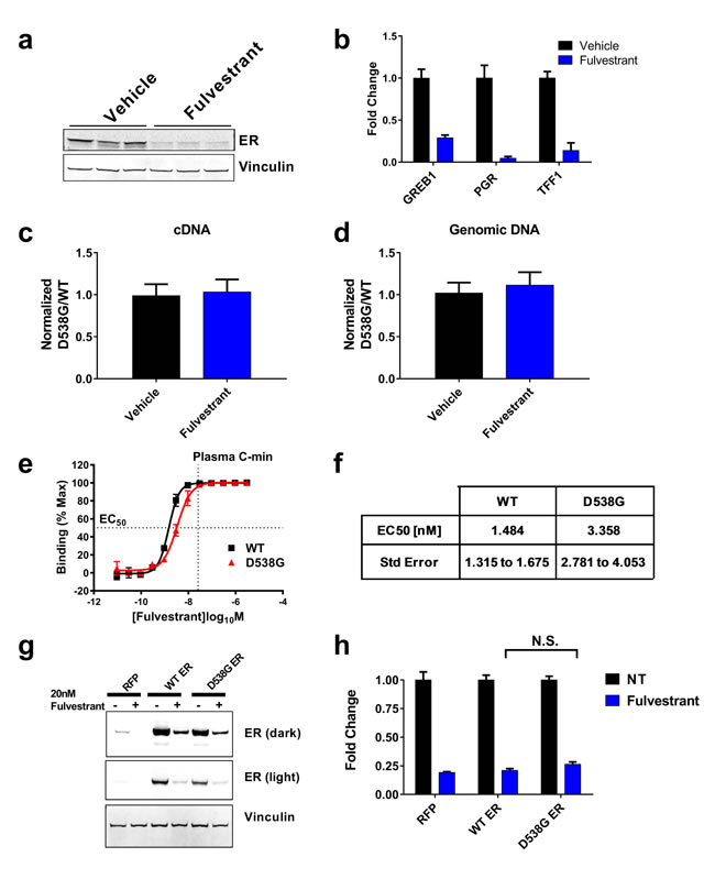 Figure 2: Fulvestrant can degrade the D538G mutant ER protein. A. Western blot measuring ER protein levels from vehicle or fulvestrant treated animals at the end of the study (Figure 1D, n = 3 animals/treatment, Fulvestrant decreased ER 72.5%, p = 0.0004). GAPDH used as a loading control. B. PCR measuring ER target gene expression from vehicle or fulvestrant treated animals. C. Genotyping of ER cDNA. Data represented as the relative fold change of D538G ER over WT ER alleles relative to vehicle control. D. Genomic WT vs. D538G ER DNA represented as in C.. E. Fulvestrant binding to the ligand binding domain of WT or D538G ER measured by displacement of 1.5nM estrogen. Vertical line indicates the plasma C-min observed in the CONFIRM trial [25]. F. EC50 calculated from E. as described in the methods/materials. p = 9.79217E-14. G. Western blot analyses of the indicated proteins in MCF7 cells stably expressing a doxycycline inducible FLAG-WT or D538G ER treated with 20nM fulvestrant for 72 in the presence of 1ug/ml doxycycline. Vinculin was used as a loading control. H. Quantification of western blot from G. normalized to the respective untreated control. Histogram represents the average of 3 replicates. Bars represent SEM. N.S. = not significant (p = 0.2443)