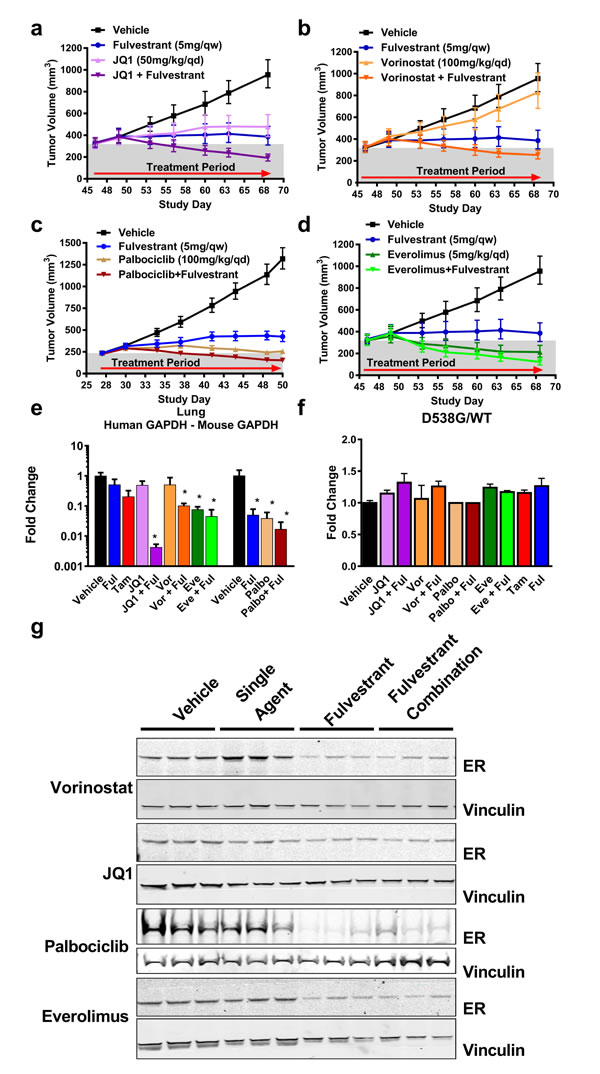 Efficacy of fulvestrant with JQ1, vorinostat, palbociclib or everolimus in the D538G ER CTX model