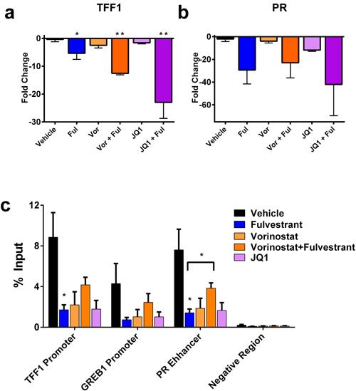 Figure 4: ER target gene expression and promoter/enhancer binding are decreased by the chromatin modifier inhibitors vorinostat and JQ1. A.-B. PCR of TFF1 and PR from indicated animals in 3A, B. Each point represents the average of 3 animals, bars represent SEM. C. Chromatin immunoprecipitations (ChIP) was performed against ER in tumors represented in Figure 3. The ‘negative region’ is a negative control describing a genomic position downstream of the PR binding site. *p < 0.05, **p < 0.005 and is compared to vehicle unless otherwise indicated. Rabbit IgG are shown in Figure S2.