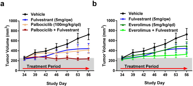 Concurrent inhibition of ER and CDK4/6 or mTOR leads to delayed tumor growth