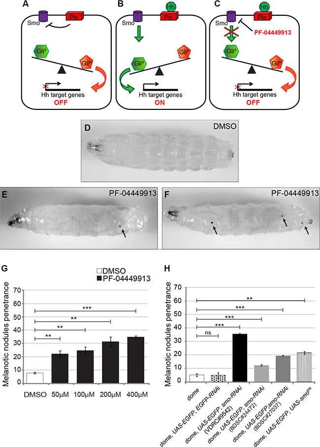 Figure 2: Pharmacological inhibition and genetic loss of the smo function alter blood cells homeostasis inducing melanotic nodules. (A-C) Schematic drawings showing the expected consequences on the Hedgehog signaling pathway in the absence of Hh (A), in the presence of Hh (B) or after PF-04449913 administration (C). (D) A w1118 m-L3 instar larva raised on DMSO-containing medium (negative control). (E, F) w1118 m-L3 larvae raised on PF-04449913-containing medium. Black arrows in E and F indicate melanotic nodules. Anterior is on the left. (G) Penetrance of the melanotic nodule phenotype upon administration with increasing amounts of PF-04449913 to w1118 larvae compared to administration with DMSO. (H) Penetrance of the melanotic nodule phenotype due to the co-expression of EGFP with either one of three independent smo-RNAi constructs (VDRC#9542-black column, BDSC#24472-pale gray column, BDSC#27037-dark gray column) or of the dominant negative smo5A construct (smoDN-vertical striped column) in the medullary zone (MZ) of the lymph gland under the control of the domeless-Gal4 driver. The negative controls, white and dotted columns, indicate, respectively, the penetrance in larvae carrying only the domeless-Gal4 driver (dome) or co-expressing EGFP and EGFP-RNAi under the control of domeless-Gal4 (dome, UAS-EGFP; EGFP-RNAi). The average phenotype penetrance due to compound administration was calculated from four to seven independent experiments, each involving 16–30 larvae. The average phenotype penetrance due to expression of either smo-RNAi or SmoDN in the MZ was calculated from three to nine independent experiments, each involving 15–225 larvae. The statistic comparisons represent Student’s t test (**P < 0.001, ***P < 0.0001, ns=not significant). Error bars indicate s.e.
