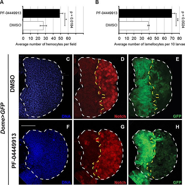 Defining the mode of action of a drug at the cellular and molecular level is key to address its efficacy and specificity. In the Drosophila lymph gland, the absence of the PSC or the inhibition of the Hedgehog signaling pathway, reduces the number of multipotent hematopoietic precursors in the medullary zone and induces premature hemocytes differentiation [31]. To assess whether PF-04449913, an inhibitor of the human Smo protein (hSmo), antagonizes Drosophila Smoothened (Smo) activity and induces phenotypes that can be connected to loss of the Hh pathway function (Figure 2A–2C), we administered wild type (wt) animals with increasing concentrations of PF-04449913 (or equal amounts of DMSO-containing medium as a negative control) for the whole feeding phase of the larval life (Figure 1B, 1C). When compared with control larvae (Figure 2D), more animals fed with PF-04449913 showed 1 to 3 small melanotic nodules (Figure 2E, 2F) with dose-dependent penetrance. At all concentrations, the melanotic nodule penetrance was significantly higher than controls, peaking at 34% in larvae exposed to 400 μM PF-04449913 (Figure 2G). In order to determine whether decreased fly smo function in hematopoietic precursor cells induces melanotic nodules, we separately expressed one of three constructs (VDRC#9542, BDSC#24472, BDSC#27037) to produce small interfering RNAs targeting smo (smo-RNAi) or the dominant negative smo5A allele (smoDN) [38] in the MZ under the control of the domeless-Gal4 (dome-Gal4) driver construct [39]. In each case, smo function knock-down or inhibition induced melanotic nodules with a penetrance ranging between 12.35% and 35.6%. The results were always significantly different to negative controls represented by larvae expressing GFP and GFP-RNAi under the control of the domeless-Gal4 driver or by larvae carrying the driver construct only (Figure 2H). The VDRC#9542 line was the most effective both in inducing melanotic nodules and in reducing Smo protein expression in the LG medullary zone as detected by immunolabeling (Supplementary Figure 1). All together these evidence suggest that PF-04449913 inhibits Smo activity. To assess whether the development of melanotic nodules correlates with increased numbers of differentiated cells in the hemolymph, we estimated the number of all circulating hemocytes and the number of lamellocytes. After feeding with PF-04449913 or DMSO-medium, we bled late-L3 (l-L3) instar larvae expressing GFP in all hemocytes under the control of the hemolectin-Gal4 (hml-Gal4) driver [33] and stained blood cells with Cy3 conjugated phalloidin. The hemolectin-Gal4 driver is active in differentiating hemocytes of the lymph gland CZ, in the circulating and sessile hemocytes. Phalloidin labels filamentous actin making easier to identify lamellocytes by their bigger size and flattened morphology [40]. Then, we counted GFP positive cells and lamellocytes. The average number of GFP positive hemocytes and lamellocytes were increased in larvae fed with 400 μM PF-04449913 as compared to those fed with DMSO (Figure 3A, 3B). This suggests that the melanotic nodules are correlated with the excess of circulating blood cells and in particular with the increase of lamellocytes, the hemocytes implicated in the encapsulation process that precedes melanisation [28, 36, 37]. During wasp egg infestation massive lamellocyte differentiation takes place. Most of the lamellocytes originates from the sessile hemocyte population that resides at subepidermal locations in a banded pattern. Only a part of the lamellocytes and circulating hemocytes have been shown to originate from the lymph gland [27]. To assess if the domeless-Gal4 driver is expressed in the sessile hemocytes population, we analyzed the GFP expression at the position where sessile hemocytes reside both in dome-Gal4,UAS-GFP and hemolectin-Gal4,UAS-GFP larvae. In hml-Gal4,UAS-GFP larvae we could clearly observe GFP expressing cells at the subepidermal positions where sessile hemocytes are localized [41] but we could not in domeGal4,UAS-GFP larvae (Supplementary Figure 2) We conclude that the dome–Gal4 driver is not active in the sessile hemocytes. This suggests that the melanotic nodule phenotype in dome-Gal4,smo-RNAi larvae should mostly depend on lymph gland derived hemocytes due to smo downregulation in the MZ. Although we cannot formally exclude that the hSmo inhibitor might act on hematopoietic compartments other than the lymph gland and induce an excess of circulating hemocytes, altogether our observations support the view that PF-04449913 should act on Smo expressing cells of the lymph gland MZ and induce increase of blood cell differentiation.