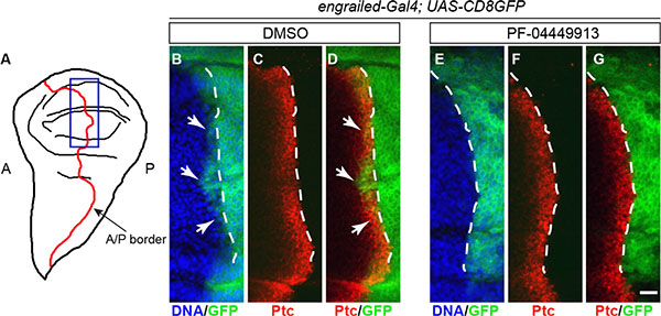 Figure 4: PF-04449913 inhibits expression of a Hh signaling target gene. (A) Drawing of a wing imaginal disc in l-L3 larvae. The border (A/P border, red line) between the anterior-A and the posterior-P compartments is indicated. The blue rectangle indicates the region shown in the area of the imaginal discs magnified in B-G and corresponding to the A/P border in the presumptive wing blade, the wing pouch,. (B–D) A/P border of the wing pouch in a wing imaginal disc from an engrailed-Gal4; UAS-CD8GFP larva administered with DMSO-medium (negative control). (E–G) A/P border of the wing pouch in a wing imaginal disc from an engrailed-Gal4; UAS-CD8GFP larva administered with PF-04449913-medium. In green, the membrane-localized CD8-GFP chimera expressed under the control of the engrailed-Gal4 enhancer-trap line; in red, the immunolocalization of the Ptc protein; in blue, the cell nuclei stained by Hoechst. The white dashed lines indicate the A/P border as defined by the posterior limit of the high-level expression domain of the Ptc protein in the anterior compartment. White arrows indicate (B, D) the few cells of the anterior compartment expressing engrailed at low level under the control of the Hh signaling. engrailed expression in anterior cells is absent (E–G) in wing imaginal disc of larvae exposed to PF-04449913. Scale bar: 10 μm.