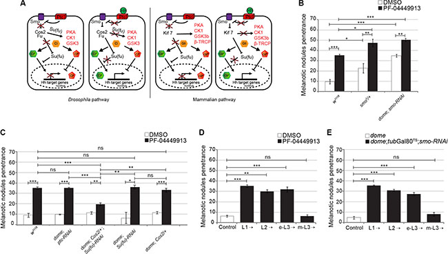 To evaluate whether reduction of smo gene function is able to synergize with pharmacological inhibition, we fed larvae heterozygous for the smo3 null allele or expressing smo-RNAi in the MZ (dome-Gal4;smo-RNAi) with either DMSO- or PF-04449913-medium. Both reduction of smo gene dosage (smo3/+) and smo knock-down (dome-Gal4;smo-RNAi) induced melanotic nodules after DMSO-feeding in, respectively, 23% and 35.5% of larvae. This confirms the requirement of the Smo protein to maintain hemocytes homeostasis and indicates a partial aploinsufficiency of the smo gene function in hematopoiesis. The melanotic nodule penetrance increased to 47% and 50%, respectively, in smo3/+ and dome-Gal4;smo-RNAi larvae, after administration of the compound (Figure 5B). Although smo function has been impaired combining either genetic LOF or tissue-specific RNAi and pharmacological inhibition, the phenotypic penetrance did not increase above 50%. This may result either from residual Smo function or from the activity of other signaling pathways controlling blood cells homeostasis [30, 33, 48]. To confirm that the hSmo inhibitor reduces Smo activity, we attempted to suppress the melanotic nodule phenotype by inducing constitutive activation of the evolutionary conserved Hh signaling pathway (Figure 5A). The binding of Hh to its receptor Ptc releases Smo from Ptc-mediated inhibition and prevents the three protein kinases PKA, CK1 and GSK3 from phosphorylating and degrading the transcriptional activator Ci that is maintained in the activator form (CiA). In the absence of Hh: i) the three protein kinases form a complex with the scaffold kinesin protein Costal 2 (Cos2) and phosphorylate Ci leading to its proteolysis and conversion to the repressor form (CiR); ii) the conformation of the Fused (Fu) kinase permits Suppressor of fused (Su(fu)) to impede Ci nuclear translocation and activity thereby promoting its conversion to the repressor form (Figure 5A) [49, 50]. We adopted established paradigms of constitutive activation of the Drosophila Hh pathway due either to LOF of Ptc, the regulator of the pathway upstream of Smo, or to concomitant LOF for two negative regulators of the pathway downstream of Smo, Cos2 and Su(fu) [47, 51–53]. We administered PF-04449913 to larvae expressing RNAi targeting the ptc function in the MZ (dome-Gal4;ptc-RNAi) or animals heterozygous for the Cos2k16101 null allele and expressing Su(fu)-RNAi in the MZ (dome-Gal4;Cos2;Su(fu)-RNAi). While after compound administration dome-Gal4;Cos2;Su(fu)-RNAi larvae had a less penetrant melanotic nodule phenotype compared to the wt (19% vs 35%), the penetrance was unchanged in larvae expressing ptc-RNAi as well as in larvae either heterozygous for the Cos2k16101 allele or expressing Su(fu)-RNAi in the MZ (Figure 5C). The fact that the phenotype could be suppressed by constitutive activation of the pathway downstream of Smo but not by constitutive activation of the pathway upstream of Smo, strongly suggests that PF-04449913 acts on Drosophila Smo itself. To define when Smo is required to maintain blood homeostasis during development by preventing excessive blood cells differentiation, PF-04449913 administration or smo-RNAi conditional expression in the MZ was performed as from different time points during the larval feeding period (L1, L2, early L3:e-L3, m-L3) until the stage l-L3 when the phenotype was evaluated. Both approaches induced the phenotype when the pathway activation was inhibited as from L1, L2 and e-L3 but not when it was inhibited as from m-L3 (Figure 5D, 5E; for details see Supplementary Materials and Methods). This suggests that Smo is still required in multipotent precursors of e-L3 larvae, when the Hh signaling prevents hematopoietic precursor cells to undertake the pathway to differentiation. Indeed, the Hh protein is firstly expressed in PSC cells of L2 larvae and is required during the L3 instar to preserve in the lymph gland MZ, the pool of quiescent blood cell precursors expressing Smo and Ci [31, 33].