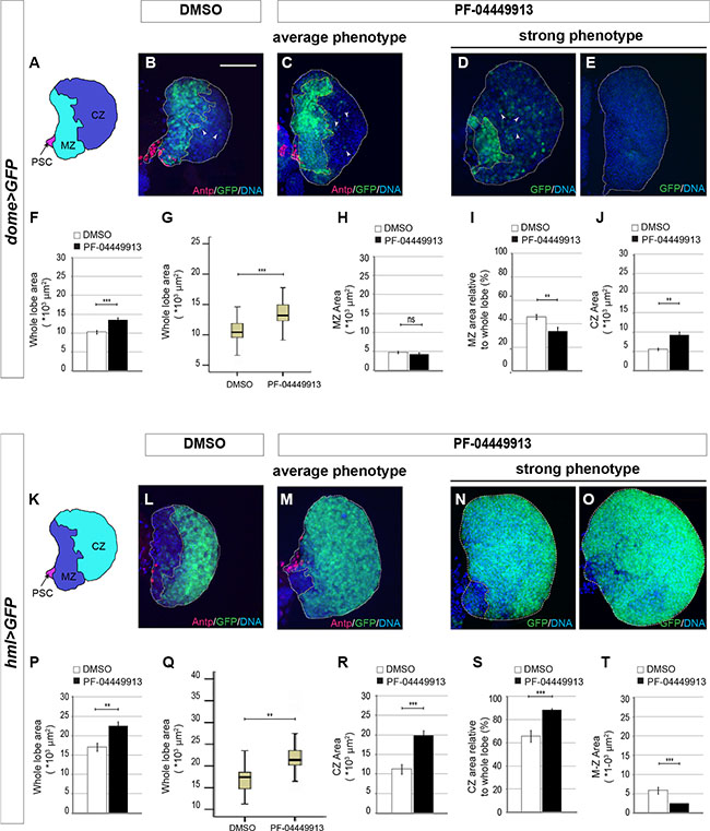 Figure 6: Smo inhibition upon PF-04449913 administration induces loss of hematopoietic precursor cells of the lymph gland medullary zone. (A) Schematic drawing of a m-L3 lymph gland primary lobe. MZ: medullary zone (green); CZ: cortical zone (blue); PSC: posterior signaling center (red). (B–E) Lymph gland primary lobes from domeGal4:UAS-GFP/+ m-L3 larvae (dome > GFP). Primary lobes are labeled by GFP in the hematopoietic precursors of the MZ, and by a DNA dye (blue). In B and C, lobes and MZ of average size from DMSO (B) and PF-04449913 treated animals (C) are labeled by an anti-Antp antibody to show the PSC cells (red). In D, E primary lobes showing a strong and incompletely penetrant phenotype in PF-04449913 treated larvae. (F–J) Quantification of the average whole primary lobe area (F), box plot showing the dispersion of the single values analyzed in F (G), absolute MZ area (H), MZ relative to whole lobe area (I), CZ area (J). White arrowheads in B–D indicate cells expressing low GFP level at the CZ position. (K) Schematic drawing of a m-L3 larval lymph gland primary lobe. MZ: medullary zone (blue); CZ: cortical zone (green); PSC: Posterior Signaling Center (red). (L–O) Lymph gland primary lobes from hemolectin-Gal4:UAS-GFP/+ larvae (hml > GFP). Primary lobes are labeled by GFP in the differentiating hemocytes of the CZ, and by a DNA dye (blue). In L and M, lobes and CZ of average size from DMSO (L) and PF-04449913 treated animals (M) are also labeled by an anti-Antp antibody to show the PSC cells position (red). In N and O primary lobes displaying a strong and incompletely penetrant phenotype in PF-04449913 treated larvae. (P–T) Quantification of the average whole primary lobe area (P), box plot showing the dispersion of the single values analyzed in P (Q), absolute CZ area (R), CZ relative to whole lobe area (S), MZ area (T). For each condition the quantitative analysis is based on 18–21 primary lobes from 10–13 dome > GFP or hml > GFP larvae. All lymph glands are dissected from m-L3 larvae (75 h AEH at 24°C). Hoechst (blue) labels nuclei (DNA). Scale bar: 50 μm. All control lobes comes from larvae grown on DMSO-containing medium. The top and bottom along the Z-axis have been set to analyze the whole lobe. White columns correspond to control lobes, black columns show lobes from treated larvae. (**p < 0.001, ***p < 0.0001, ns = not significant). Error bars indicate s.e., except for the box plots in G and Q where the ends of the whiskers represent the minimum and the maximum value of the corresponding data.
