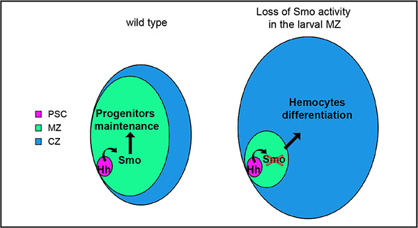 We conclude that the human Smo inhibitor PF-04449913 blocks the Hh signaling pathway activation in Drosophila hematopoietic precursor cells. This alters hematopoietic homeostasis most likely inducing multipotent precursor cells of the MZ to exit prematurely from quiescence and to undertake the differentiation pathway, migrate into the lymph gland CZ (Figure 7) and enter into the circulating hemolymph.