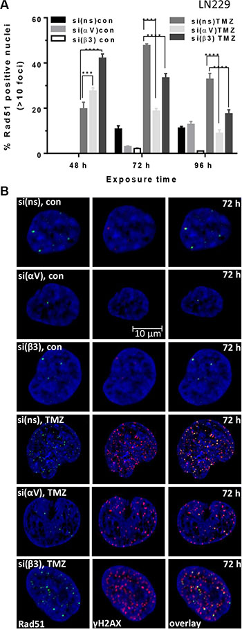 Figure 5: Induction of Rad51 foci upon TMZ/αVβ3 integrin silencing. (A) LN229 cells were transfected with αV-, β3- or ns-siRNA and exposed to 100 μM TMZ. At indicated time points, the cells were stained for Rad51 and γH2AX. Counterstaining of the nuclei was performed using TO-PRO-3. The data are the mean of two independent experiments in duplicates ± SD. *p ≤ 0.05 significant, **p ≤ 0.01 very significant, ***p ≤ 0.005 highly significant, ****p ≤ 0.001 most significant. n.s., not significant. (B) The representative nuclei at 72 h upon TMZ exposure showing co-localization (overlay) of Rad51 foci (green staining) and γH2AX foci (red staining). The nuclei were stained with TO-PRO-3 (blue staining).