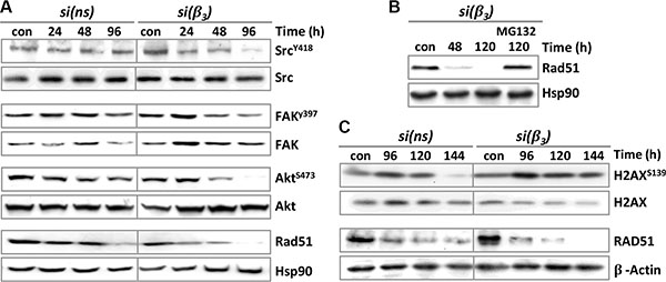 We also analyzed whether the signaling kinases FAK, Src and ILK are modulated upon β3 knockdown. It is well known that tyrosine 397 of the FAK protein is the main target of autophosphorylation, which leads to the activation of FAK, and renders pFAK (Y397) as high-affinity partner for binding of Src [24]. Similarly, the autophosphorylation at Y418 is required for full catalytic activity of Src [25]. Another catalytic adaptor that directly binds the β1 and β3 integrin cytoplasmic tails is ILK [26]. The data show that pFAK and pSrc expression was reduced 24–96 h upon TMZ treatment (following 48 h β3-siRNA transfection) (Figure 7A), while the expression of ILK was not changed (data not shown), indicating that integrin αVβ3 signals in glioma cells through pFAK and pSrc. In line with this, β3 silencing also resulted in dephosphorylation of the pro-survival kinase Akt (Figure 7A). Most interestingly, TMZ exposure led to a reduction in Rad51 protein expression, but upon β3 silencing the reduction was strongly enhanced and started even earlier i.e. 24 h after TMZ exposure. Reduction of Rad51 was due to proteasomal degradation (Figure 7B) and was most pronounced 120-144 h upon TMZ exposure and paralleled the H2AX phosphorylation (Figure 7C). Since Rad51 degradation was also observed in control-siRNA transfected cells, albeit to a much lower extent, this effect appears to result partially from TMZ itself, but is strongly amplified following β3 silencing (Figure 7A, 7C).