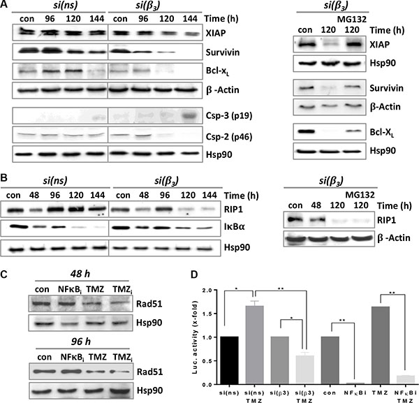 Figure 8: Expression of different pro- and anti-apoptotic factors upon TMZ/αVβ3 integrin silencing. (A) LN229 cells were transfected with integrin β3- or ns-siRNA and 48 h upon transfection exposed to 100 μM TMZ (left panel) or additionally exposed to MG132 (10 μM) 24 h after begin of TMZ treatment (right panel). The cells were collected 96-144 h after TMZ exposure and subjected to western blot analysis of XIAP, survivin, Bcl-xL and caspase-3/caspase-2 expression. β-actin and Hsp90 were used as loading control. (B) LN229 cells were transfected with integrin β3- or ns-siRNA and 48 h later exposed to 100 μM TMZ (left panel) or additionally exposed to MG132 (10 μM) 24 h after begin of TMZ treatment (right panel). The cells were collected at different times upon TMZ exposure and subjected to western blot analysis of RIP1 and IκBα. (C) Time-dependent expression of Rad51 after treatment of LN229 cells with NFκB inhibitor (10 μM NFκBi), 100 μM TMZ, or a combination of both (TMZi). (D) NFκB activity was determined by the dual luciferase reporter assay. Cell lysates were analyzed in triplicates and standardized for transfection using a renilla luciferase construct. The unexposed controls (con, si(ns), si(β3)) were set to 1. NFkBi: NFκB inhibitor (10 μM). The data are the mean of two independent experiments in duplicates ± SD. *p ≤ 0.05 significant, **p ≤ 0.01 very significant, ***p ≤ 0.005 highly significant, ****p ≤ 0.001 most significant.